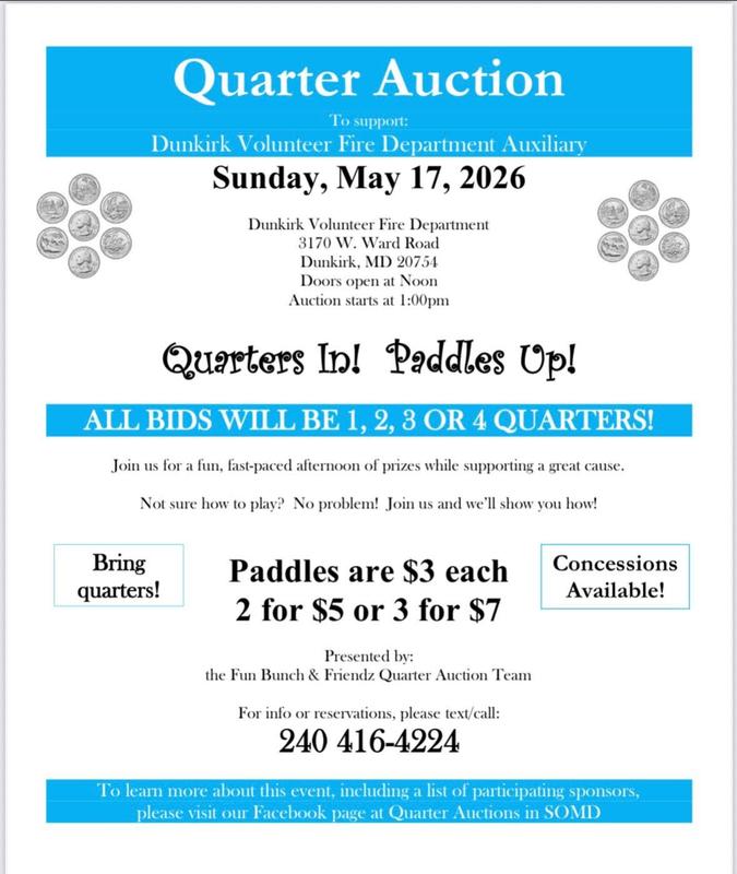 ๐๏ธ๐ช Get ready for a fast-paced afternoon of prizes and community fun! Weโre hosting a Quarter Auction to support the Dunkirk Volunteer Fire Department Auxiliary, and you wonโt want to miss it. Whether you're a pro or a first-timer, come out and playโweโll show you the ropes! THE DEETS: ๐ Sunday, May 17, 2026 ๐ Doors open at Noon | Auction starts at 1:00 PM ๐ Dunkirk VFD (3170 W. Ward Road) HOW TO PLAY: โข Bids: Only 1, 2, 3, or 4 quarters! โข Paddles: $3 each | 2 for $5 | 3 for $7 โข Pro Tip: Donโt forget to bring your quarters! ๐ช ๐ Concessions will be available! (Please note: No outside food or drink allowed, so come ready to snack and support the Auxiliary!) ๐ Reservations: Text or call 240-416-4224 to save your seat. Presented by the Fun Bunch & Friendz Quarter Auction Team. Check out the Quarter Auctions in SOMD Facebook page for a full list of sponsors!